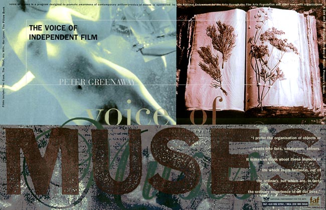 | This piece was one in a series of three posters to acknowledge and promote the work of independent filmmakers. The promotion I entitled 'Voice of Muses' referring to the Muses of Greek myth who were said to inspire artists and writers. This particular poster, for British director Peter Greenaway, makes use of images from his films and a type treatment which I distressed and manipulated using multiple processes. The type running around the edge lists his other films and the type below right is a quote from Mr. Greenaway. Let it be said that, if he achieved nothing else, Mr. Greenaway made typography sexier than it ever was in his film The Pillow Book, starring Vivian Wu and Ewan McGregor. |